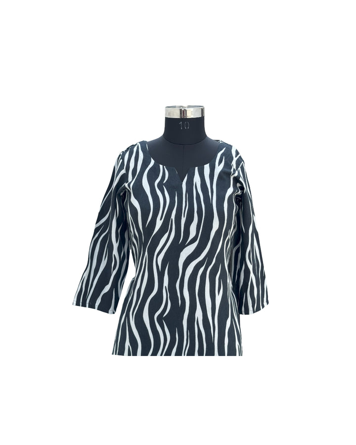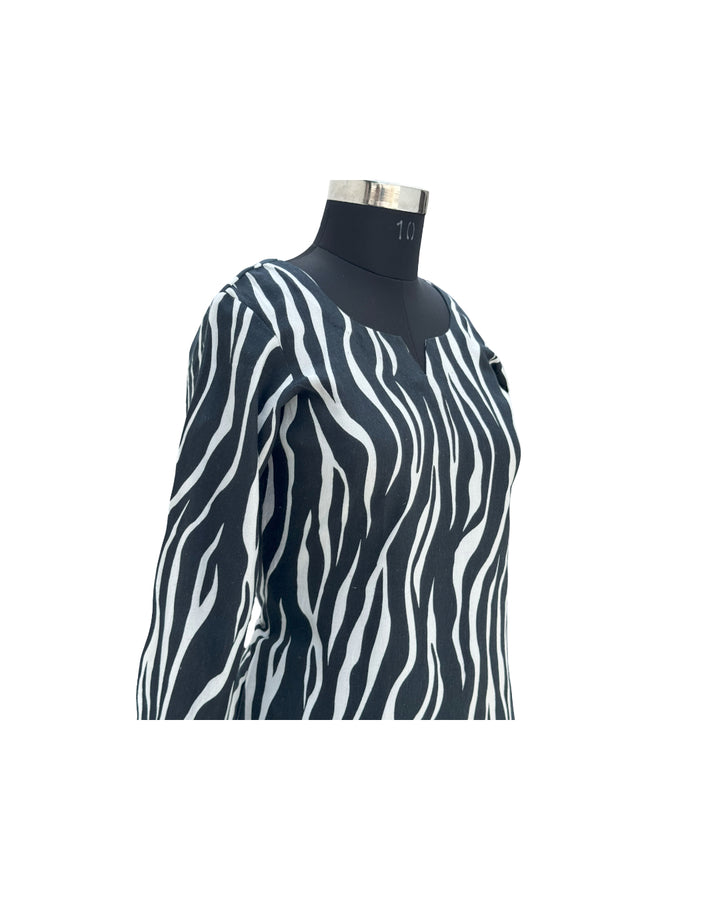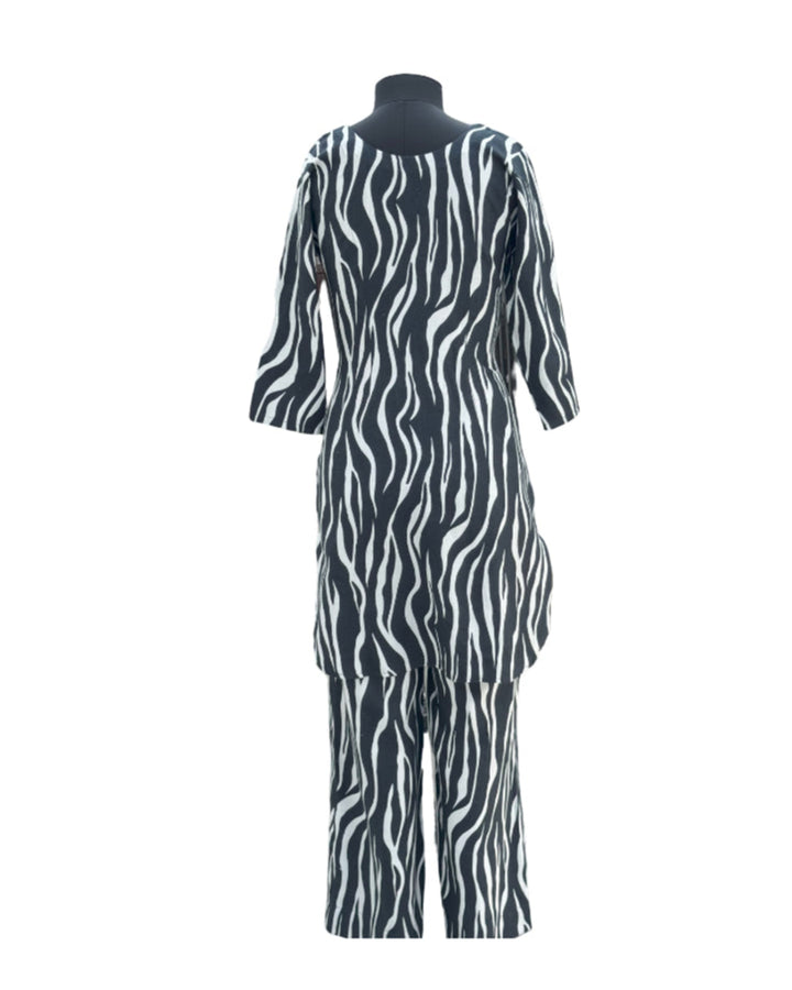 Make a statement with our eye-catching Black & White Zebra Print Co-ord Suit Set. This modern ensemble features a stylish kurta with striking black and white zebra stripes, designed with a comfortable neckline and practical 3/4 sleeves. It is perfectly complemented by matching pants in the same vibrant print, creating a seamless and fashion-forward look.
