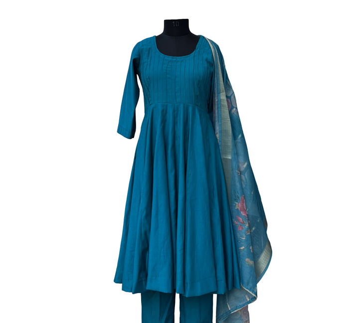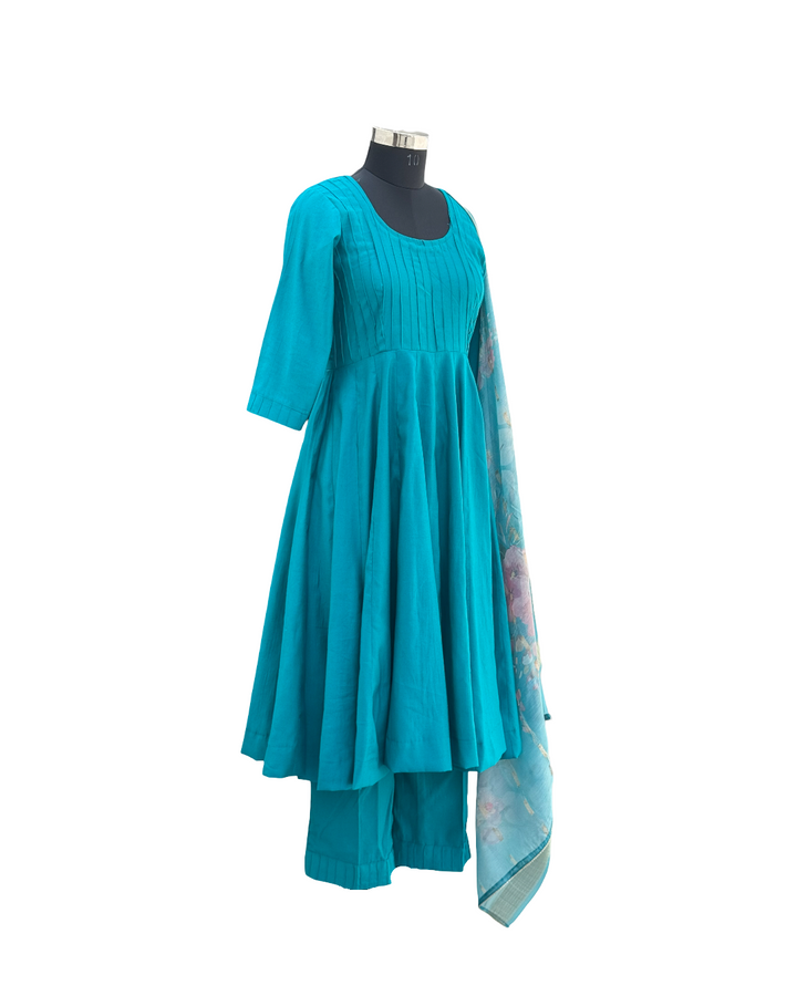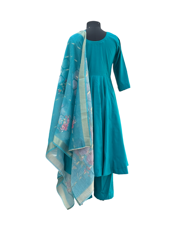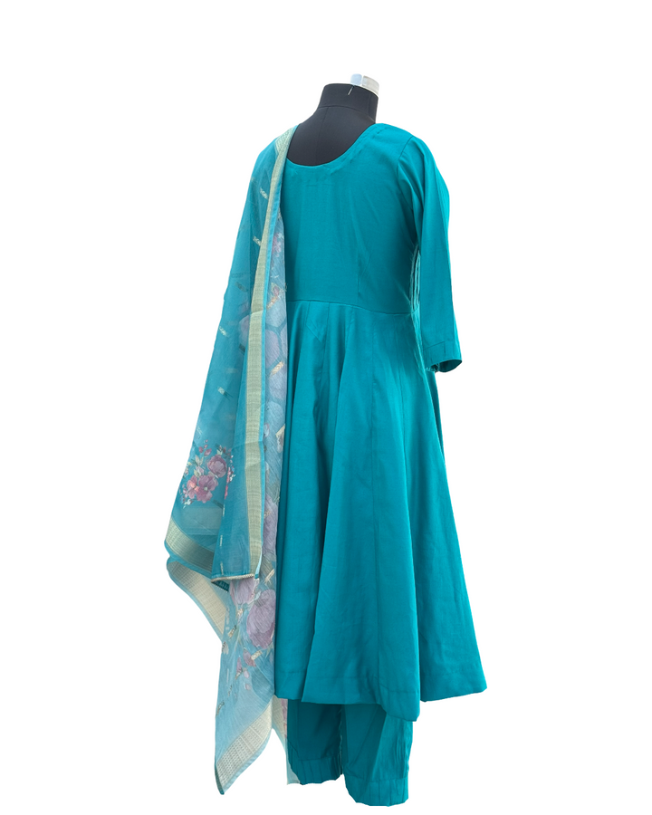 Elegant Teal Vichitra Silk Anarkali Suit Set with Floral Organza Dupatta