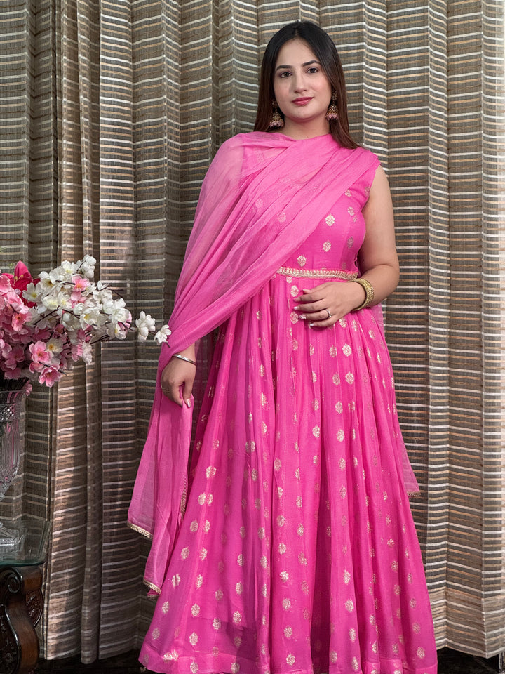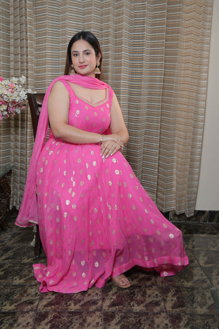 Dazzle and delight in our stunning Sparkling Rani Pink Anarkali Suit, a radiant ensemble that combines classic charm with a modern sparkle. This beautiful anarkali gown features a flattering sleeveless design with a gracefully cut neckline, possibly adorned with delicate gold piping or subtle embroidery that enhances its elegance. The vibrant Rani pink fabric is richly embellished with an all-over gold foil print, scattered in a charming motif like polka dots or tiny blossoms, creating a captivating shimmer with every movement. The flowing silhouette of the anarkali flares beautifully, offering a regal and flattering look that suits various body types.