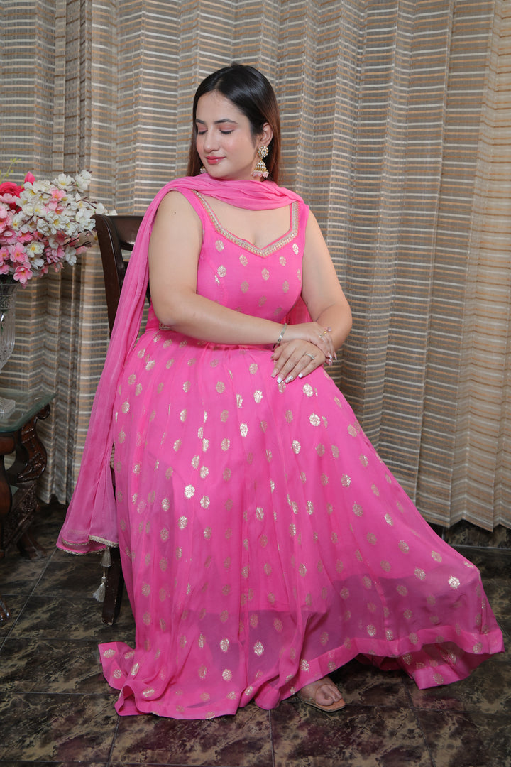 Sparkling Rani Pink Anarkali Suit with Gold Foil Print & Dupatta