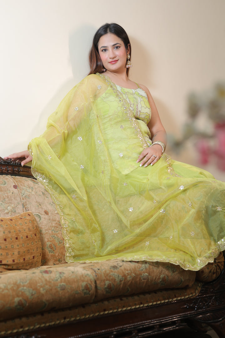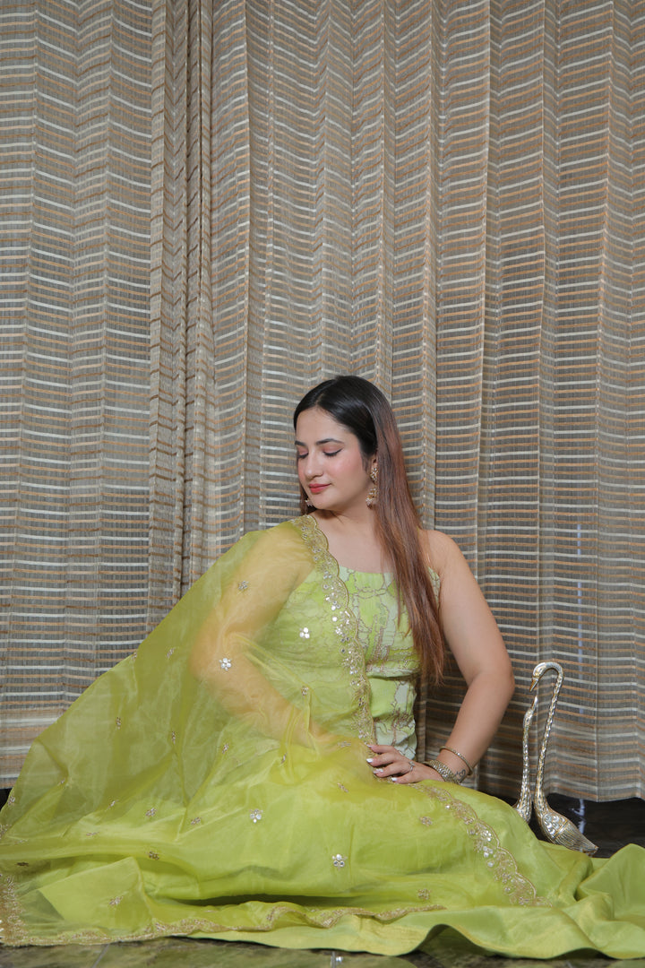 The accompanying sleeveless blouse, in a complementary hue, features coordinating embroidery around the neckline, enhancing the ensemble's cohesive design. The light and airy fabric ensures comfort, allowing for effortless movement and all-day wear. Completing this enchanting look is a sheer dupatta, likely crafted from a delicate organza or net, adorned with scattered embellishments and a beautifully finished border that ties the entire outfit together with finesse.